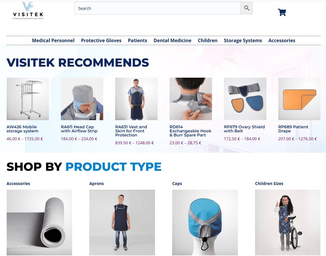 Som webbredaktör för VISITEK har jag utvecklat en webbshop för försäljning av strålskyddsprodukter.